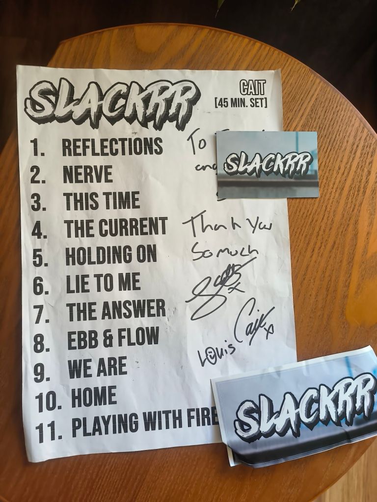 We finally headed over to the merch stand where the Slackrr t-shirts were only £10 and couldn’t say no to yet another bargain! I (St Jimmy) got served by the band members and took the opportunity to ask for the setlist. To our surprise they went one step beyond and signed it for us. They really appreciated us being there which is always great.